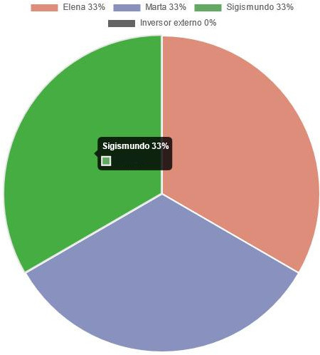 Tres socios, Elena, Marta y Sigismundo tienen, cada uno, 100 acciones de la empresa Servicios Digitales SA. Puesto que el capital social de esta empresa está dividido en 300 acciones con un valor de 20€ la acción, cada uno de los socios posee un tercio de la empresa.